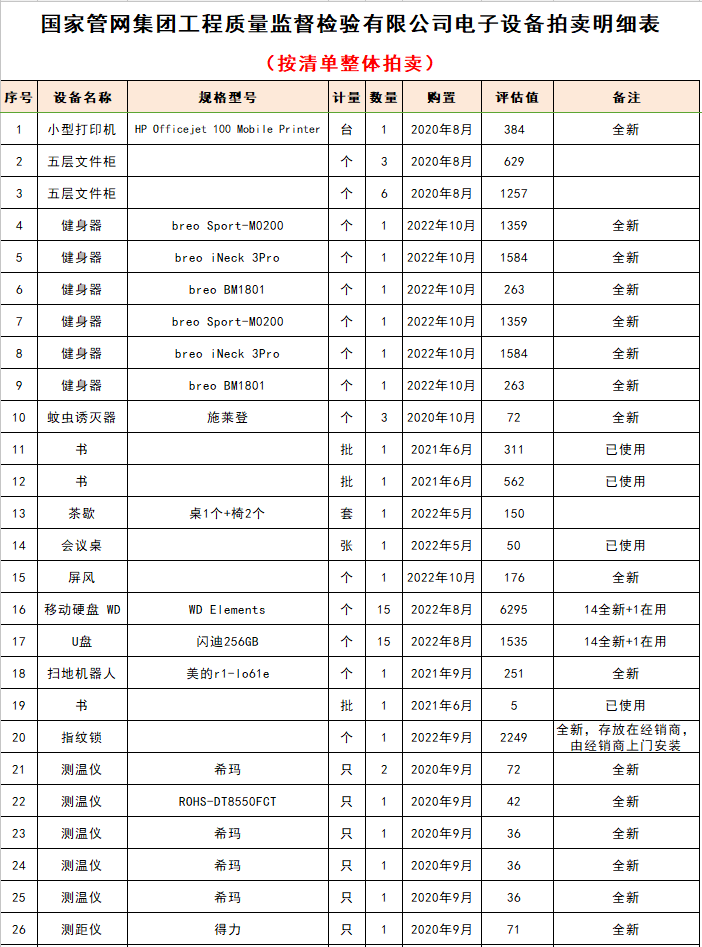 關(guān)注微信公眾號我公司受委托,將于近期拍賣:國家管網(wǎng)集團(tuán)工程質(zhì)量監(jiān)督檢驗(yàn)有限公司電子設(shè)備及辦公用品一批,多數(shù)設(shè)備為全新未使用。主要包含:卡薩帝冰吧(全新未使用),大疆航拍器(全新未使用),松下洗地機(jī)(未使用),測溫儀測距儀(全新未使用),指紋鎖(全新未安裝),按摩儀(未使用),移動硬盤和U盤(全新未使用),華為筆記本電腦、復(fù)印機(jī)、打印復(fù)印一體機(jī),文件柜、屏風(fēng)等。