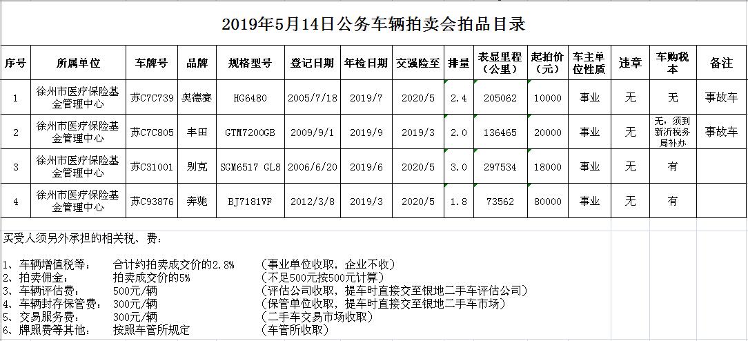 關(guān)注微信公眾號受委托,我公司定于2019年5月14日10時在徐州市中山南路55號本公司拍賣廳通過現(xiàn)場和中國拍賣行業(yè)協(xié)會網(wǎng)絡(luò)拍賣平臺結(jié)合拍賣的方式公開拍賣以下車輛: