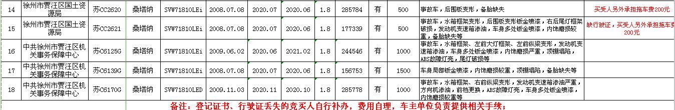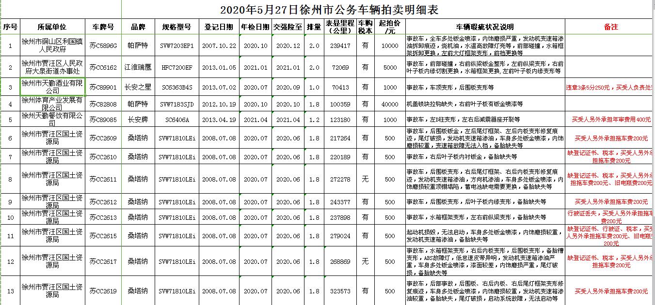 關(guān)注微信公眾號(hào)受委托,我公司定于2020年5月27日13:00時(shí)在徐州市銀地二手車交易市場四樓東南拍賣大廳通過現(xiàn)場和汽車街網(wǎng)絡(luò)拍賣平臺(tái)同步進(jìn)行的方式公開拍賣以下公務(wù)車輛: