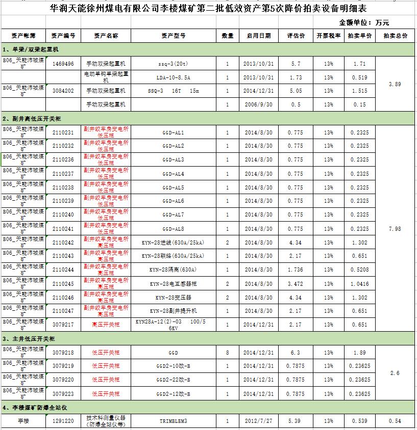 2、華潤天能李樓煤礦二手礦用設(shè)備一批。主要包括:主副井提升機(jī)、主副井電控裝置、單雙梁起重機(jī)、副井高低壓開關(guān)柜、主井低壓開關(guān)柜、防爆全站儀等。(保證金10萬元)