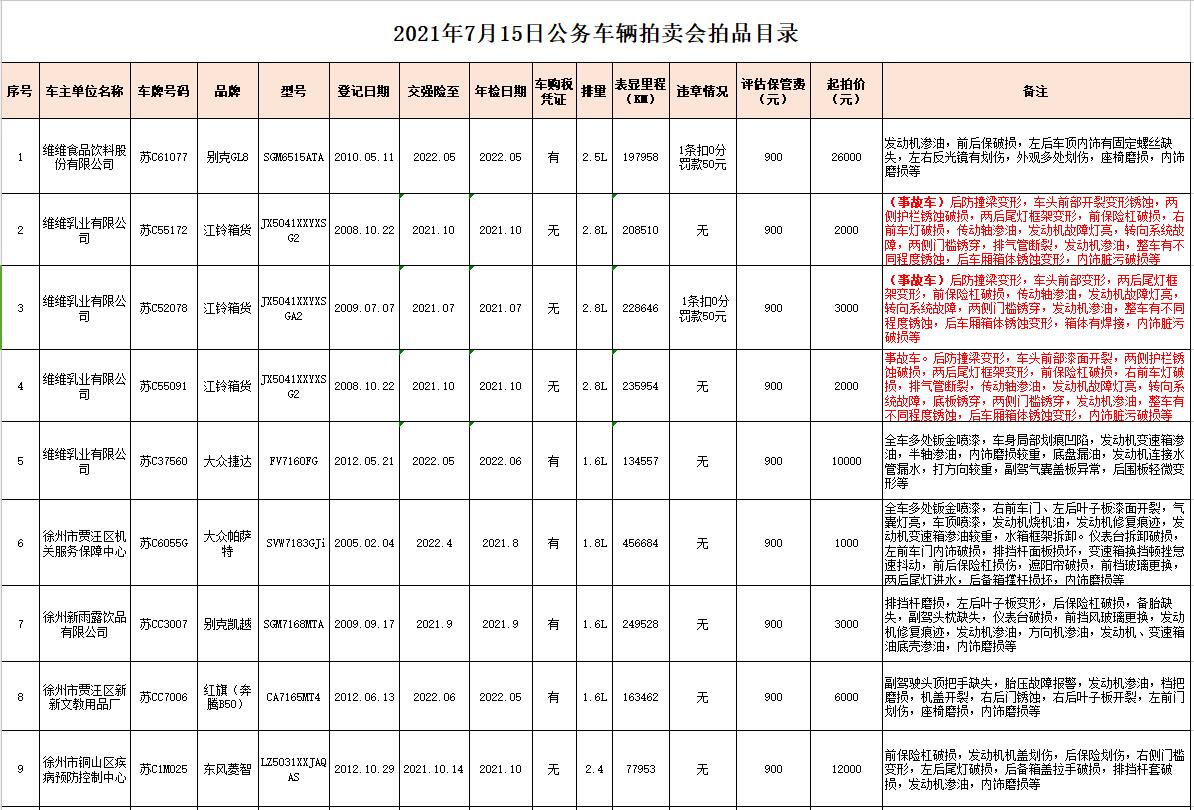7月13日、14日在徐州銀地二手車交易市場展示。有意競買者請持有效證件到我公司辦理報名手續(xù),并交納每輛車1萬元保證金即可參拍,報名截止至7月14日16時。