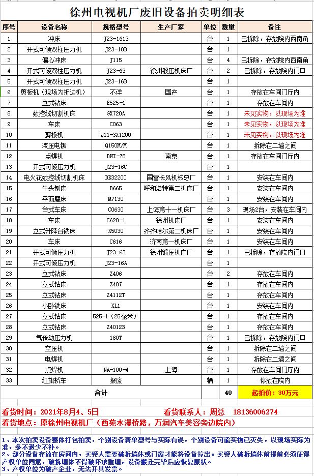 關(guān)注微信公眾號(hào)我公司受委托,定于2021年8月6日上午10時(shí)(延時(shí)除外)在中拍平臺(tái)公開(kāi)拍賣(mài):徐州電視機(jī)廠廢舊設(shè)備一批。主要包含:沖床、壓力機(jī)、折邊機(jī)、鉆床、機(jī)床、車(chē)床、刨床、磨床、銑床等、空壓機(jī)、電焊機(jī)等。